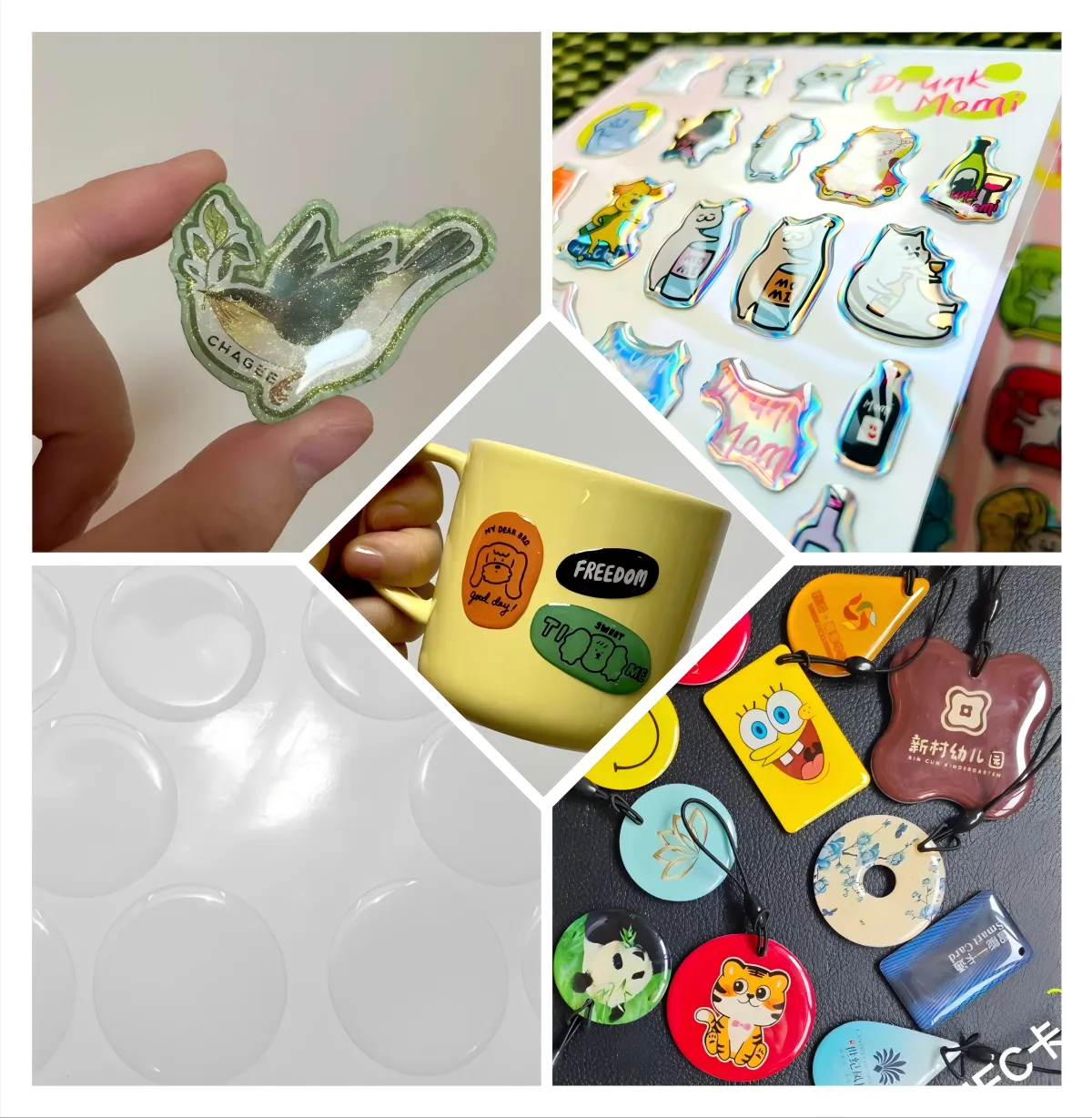 Dome epoxy harpiks klistremerker, også kalt epoxy dome labels eller 3D resin domed decals, er selvklebende produkter laget ved å påføre et gjennomsiktig, høyglans epoxy resin lag over trykte design. Harpiksen danner en hevet, kuppelformet overflate som øker både visuell appell og holdbarhet.