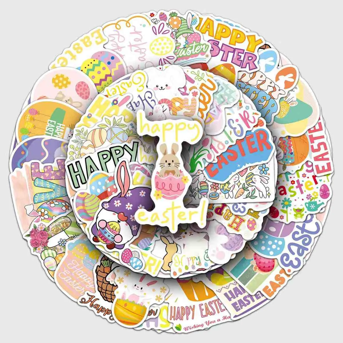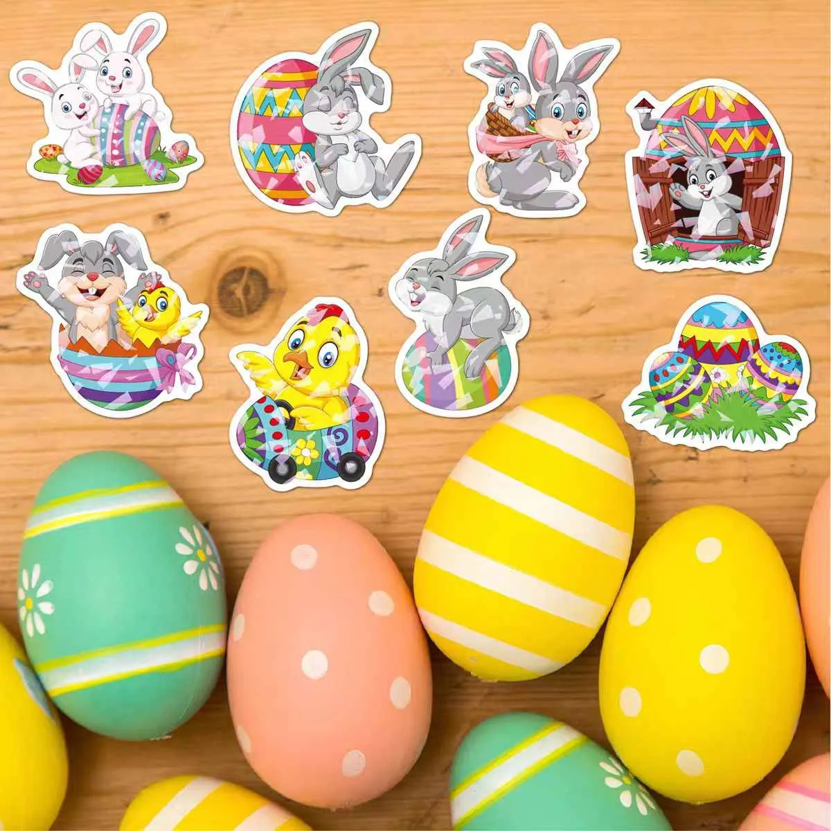 Passer til ulike påskebruk: små klistremerker for egg eller sjokoladeskall, medium for gaveesker og kurver, og store for vindusutstillinger. Fjernes enkelt uten rester fra overflater som glass, plast eller tre.