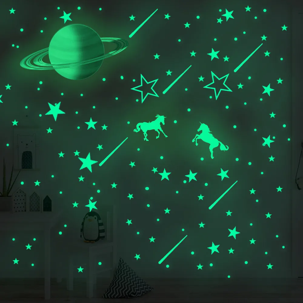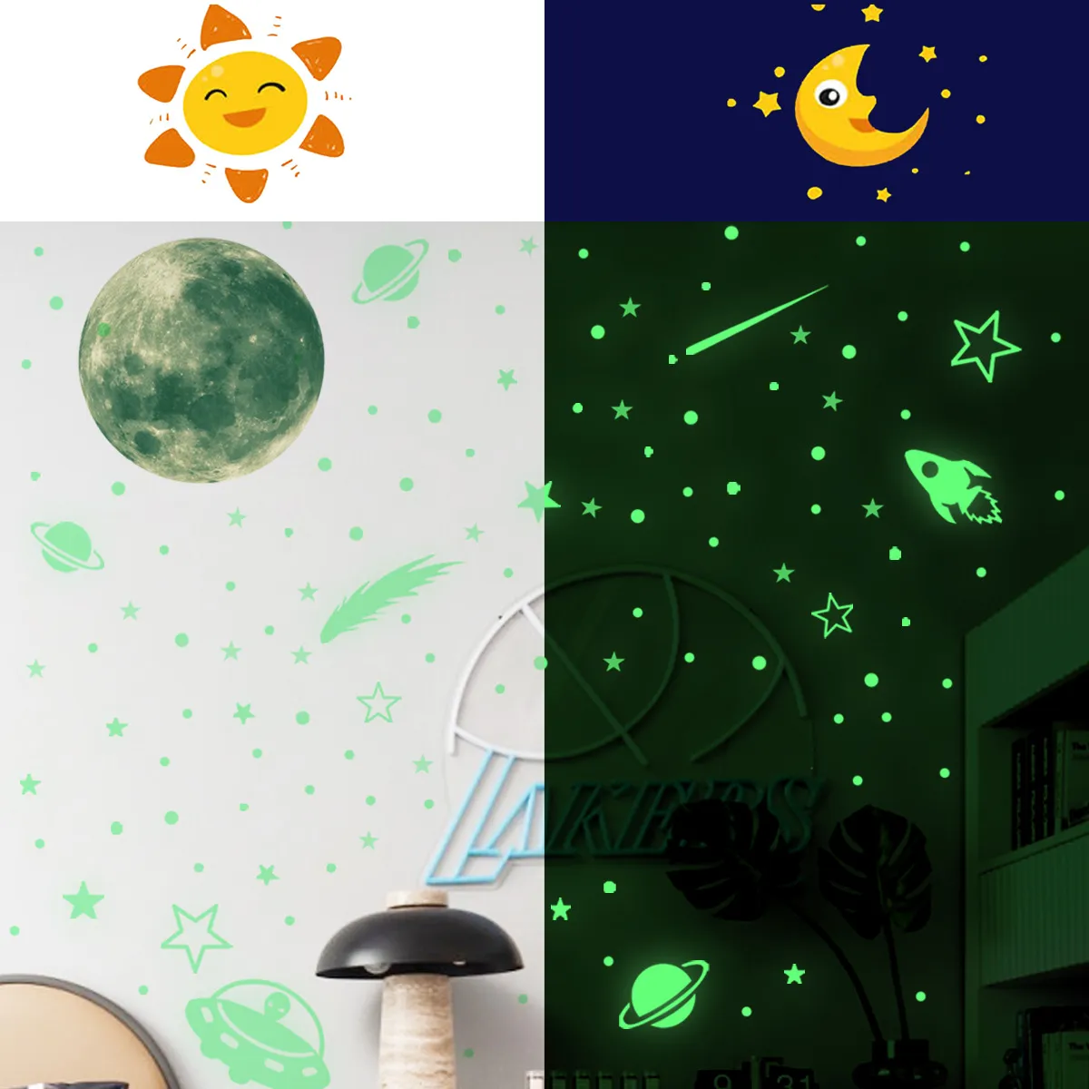 Lysende veggklistremerker, trenger ikke å bore hull og vil ikke skade veggen. Bare bruk dem forsiktig, så kan du nyte en myk lysende effekt om natten. Den absorberer lys i løpet av dagen og lyser naturlig om natten. Det koblede designet er trygt og miljøvennlig, noe som gjør det egnet for familier med babyer. Mønsteret er klart og kantene er fine. Det kan være godt festet i taket eller veggen. Det vil ikke etterlate noe lim når det er revet av og er lett å erstatte. Ingen behov for kompliserte kombinasjoner. Bare noen få enkle klistremerker kan gi plassen et helt nytt utseende.