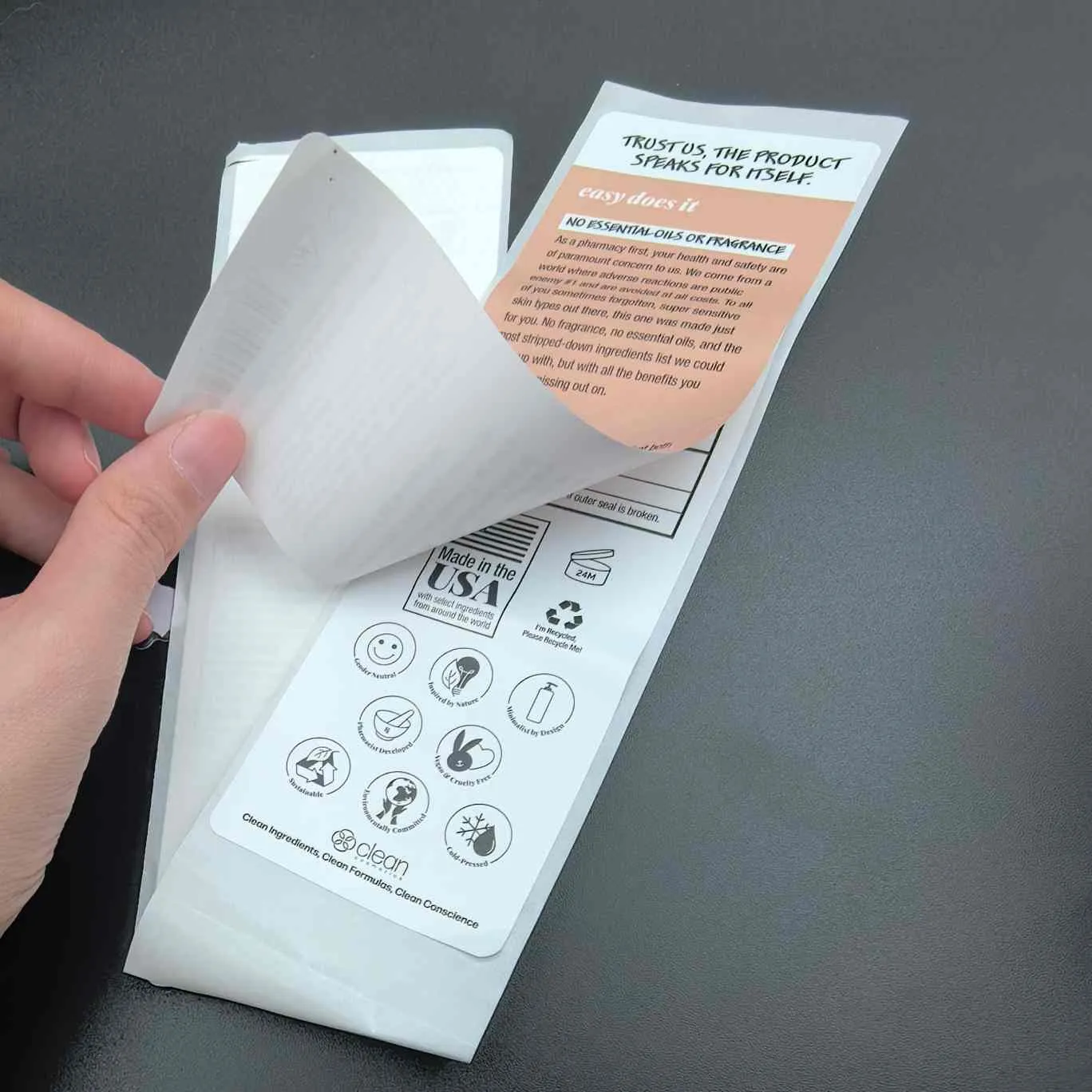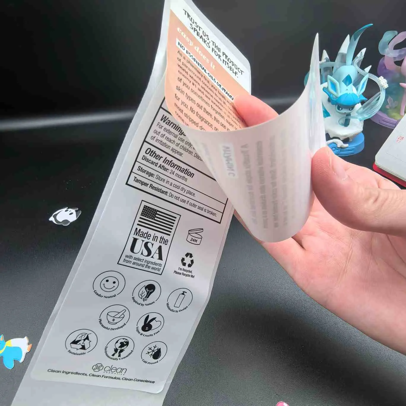 Skrell og les etiketter:Den mest grunnleggende typen, Det kalles også multiLayer for kosmetiske etiketter. Det øvre laget er lett å skrelle av, og det indre laget inneholder utvidet informasjon. Det brukes ofte til ansiktsmasker, serum og andre småpakkede produkter.