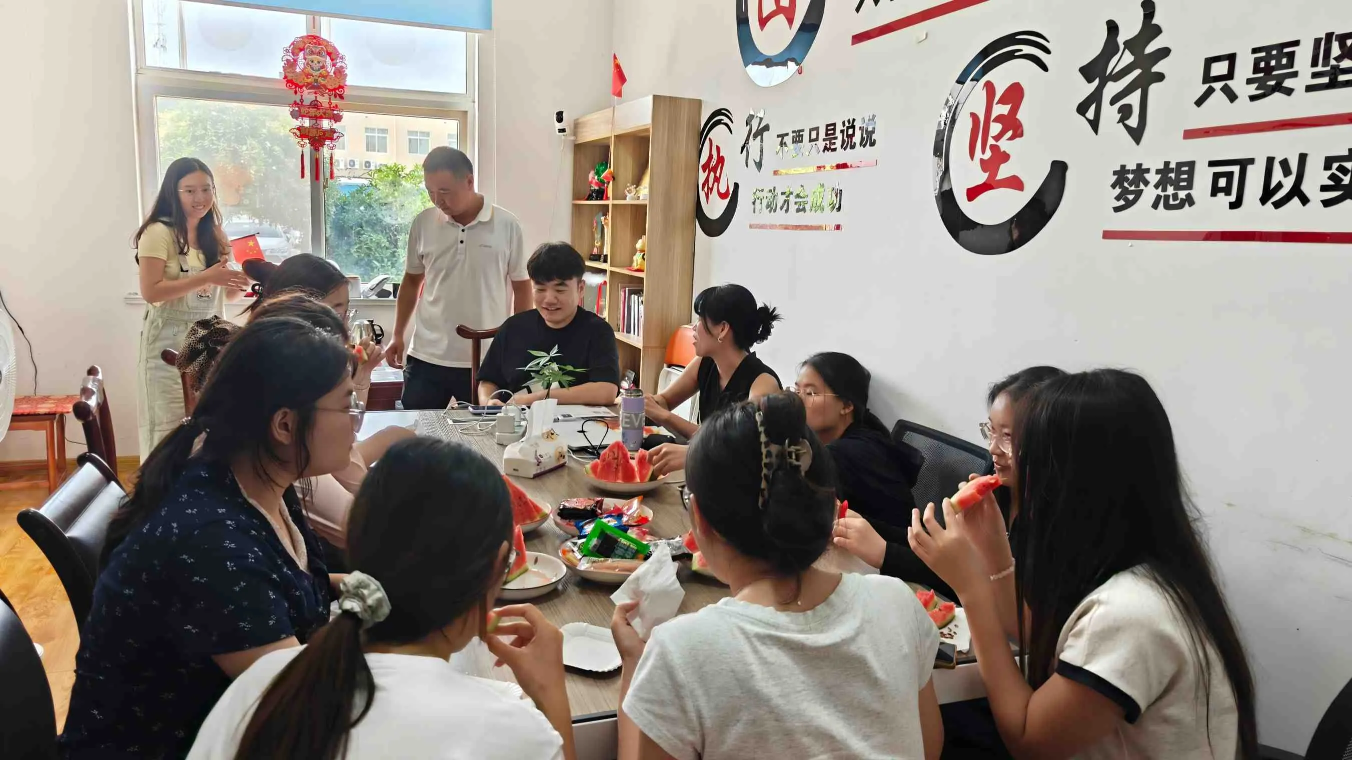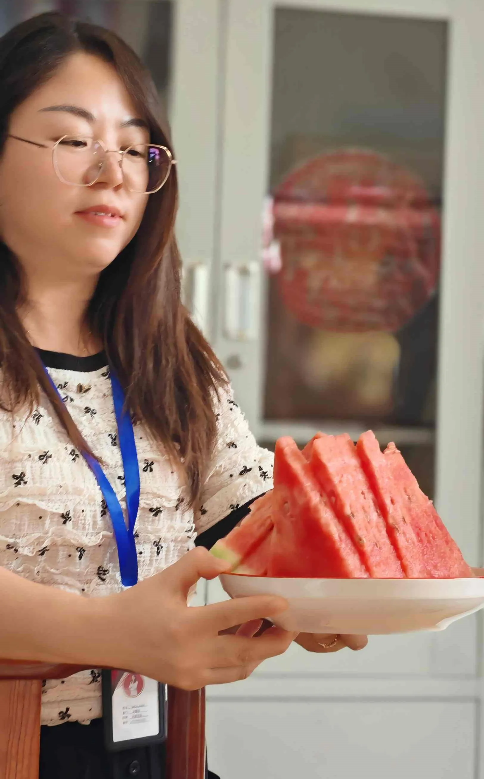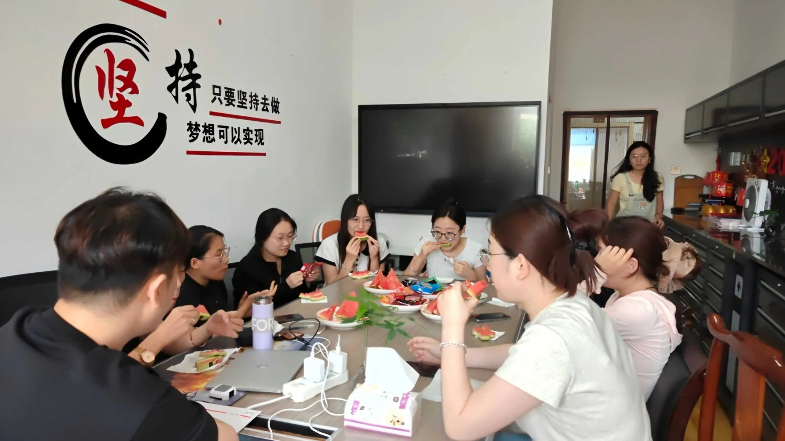 På arrangementsstedet ble det vist en rekke snacks pent, alt fra sprø nøtter, søt tørket frukt til forskjellige utsøkte kaker. De rike og mangfoldige snacks møtte alle de forskjellige smakspreferansene for alle. Og den mest iøynefallende varen var den nyopptatt store vannmelonen fra kjøleskapet. Den grønne huden på vannmelonen ble pakket rundt det knallrøde kjøttet, og da den ble skåret opp, sølte saften ut og en søt aroma fløt mot dem. Det ble det mest populære "kjøleverktøyet" i den varme sommeren. De ansatte satt i grupper og holdt vannmelonen i hendene og smakte på snacks, og de avslappede chattestemmene og munter latter sto stadig og falt. Hele kontorområdet var fylt med en atmosfære av glede.