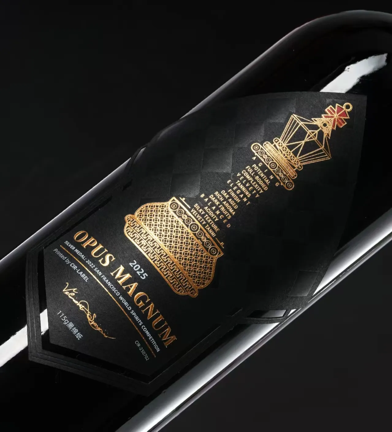 Dettevinetiketthar omfattende gullfoliestempling. Den svarte bakgrunnen er sammenkoblet med gylne linjemønstre, mens teksten bruker en kombinasjon av gull og hvitt. Lysstyrken i gullet og glansen fra foliestemplingen, sammen med de litt opphevede mønstrene og teksten, skaper fremheving og tydelig lagdeling, og gir en klassisk og elegant estetikk.