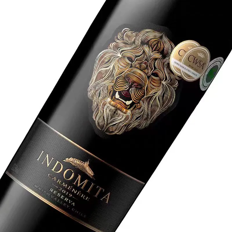Dettevinetikettbruker en delt design. Den nedre delen har en lineær bakgrunnstekstur, mens teksten, slottet og øvre og nedre kanter er stemplet med antikk kobbergullfolie. Teksturen og gradientfargene til løvehodet gir glans og 3D-effekt, noe som gjør at hele etiketten ser strålende ut under lys og tiltrekker forbrukernes oppmerksomhet.
