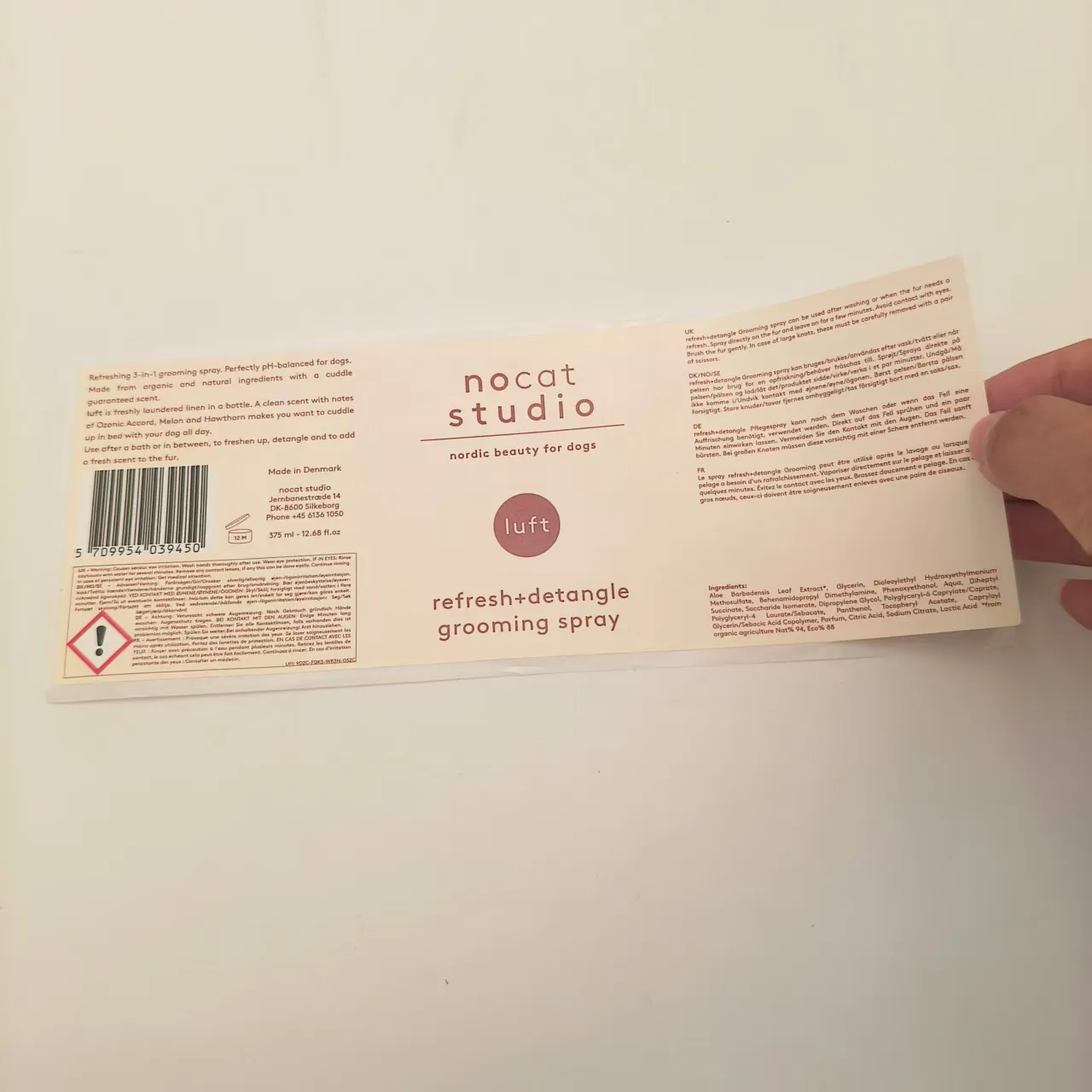 Jojopack Company har spesielt designet en avansert etikettløsning for PET Conditioners. Våre sprayflaskeetiketter er laget av vanntett og tårebestandig materiale, og produktetiketten kan opprettholde lys og varig farge selv i et fuktig miljø. Etiketten inneholder informasjon som produktnavn, ingredienser, sikkerhetsinstruksjoner, funksjoner og forholdsregler, og er ordnet på en ordnet måte, noe som hjelper merkevaren med å forbedre dens visuelle konkurranseevne.